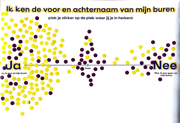 Bij binnenkomst kozen bezoekers een gele of paarse sticker — plattelander of stedeling — wat meteen een gesprek op gang bracht. Hoe bepaal je dat eigenlijk? Iedereen mocht zes stickers plakken bij verschillende stellingen, om alvast in de thematiek van de voorstelling te komen. Zo ontstond een directe, kleurrijke weergave van de uiteenlopende meningen in de zaal. Het leidde tot nieuwsgierige blikken en gesprekken. Zijn er patronen ontstaan? Of juist niet? De resultaten van deze publiekspeiling zijn hieronder te zien.